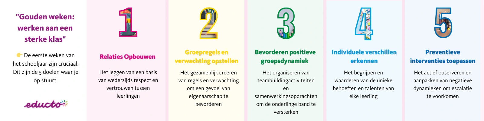 De gouden weken zijn méér dan een introductiefase: het is het fundament van het schooljaar. Door deze tips bewust toe te passen, ontstaat er een klas waarin vertrouwen, betrokkenheid en samenwerking centraal staan. Dat komt niet alleen het groepsklimaat ten goede, maar ook de ontwikkeling van elke individuele leerling.